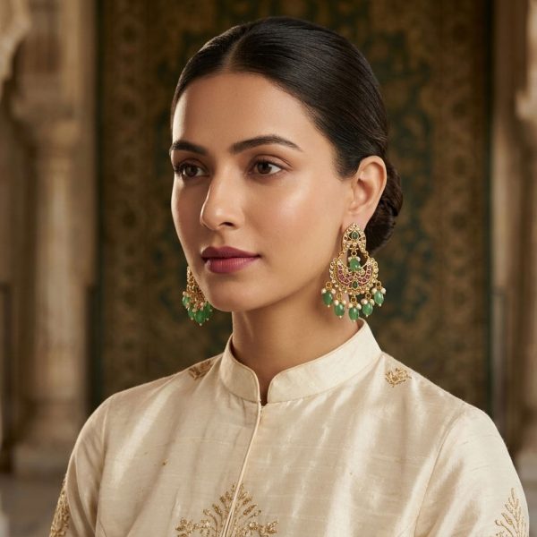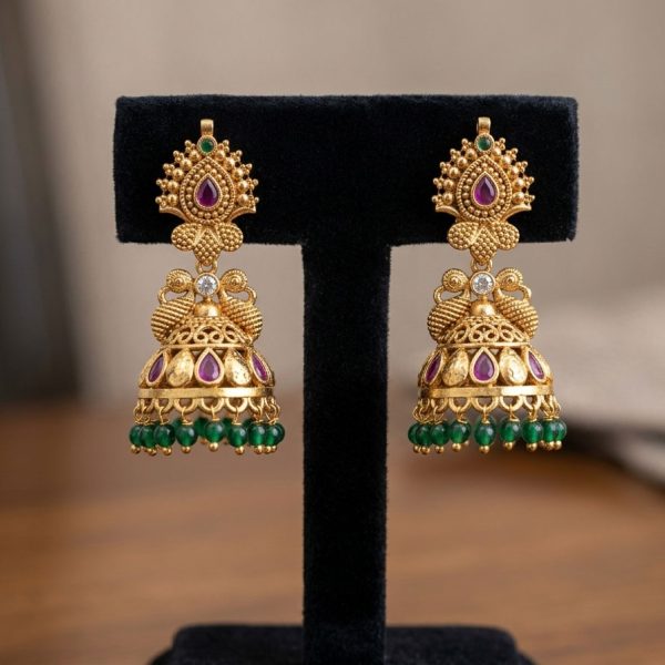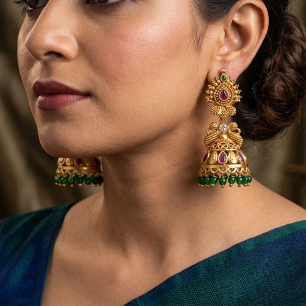 Traditional gold-tone jhumka earrings adorned with ruby-tone stone highlights, subtle green accents, and delicate green bead drops. Intricately crafted with a classic festive appeal, they are perfect for adding elegance to ethnic and special-occasion wear.