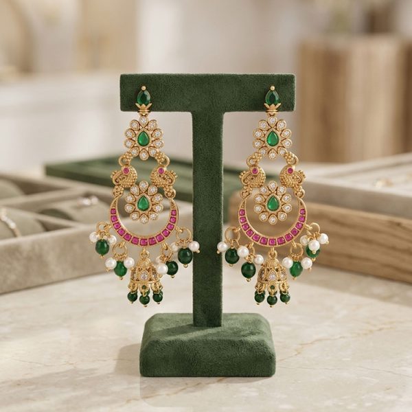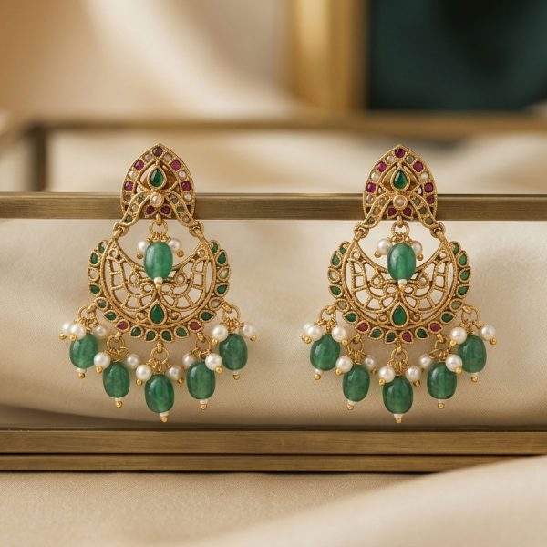 Elegant gold-tone chandbali earrings featuring intricate filigree detailing, green stone accents, ruby-tone highlights, and delicate pearl with green bead drops. A graceful ethnic design that adds royal charm to festive, wedding, and traditional looks.