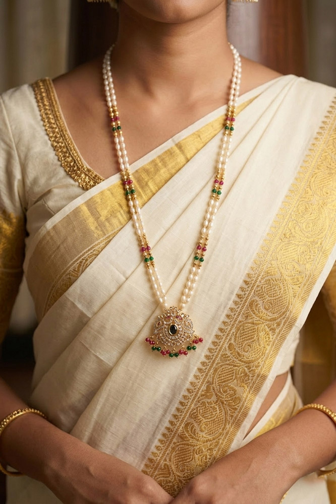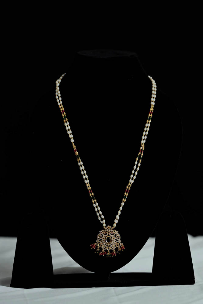 An elegant double-layered pearl chain accented with subtle ruby and emerald-toned beads, finished with a delicately crafted pendant. A timeless piece that beautifully complements traditional sarees and festive ensembles.