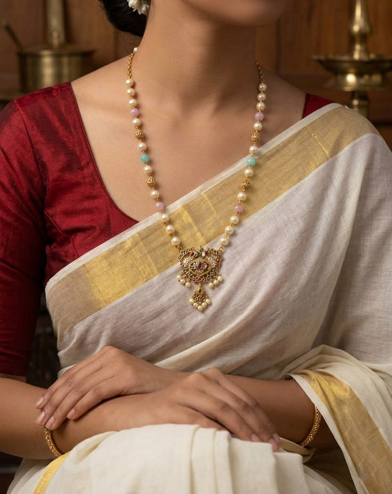 A graceful pearl long chain accented with soft pastel beads and an intricately crafted drishti-inspired pendant finished with delicate pearl drops. A charming piece that adds traditional elegance to sarees and festive looks.