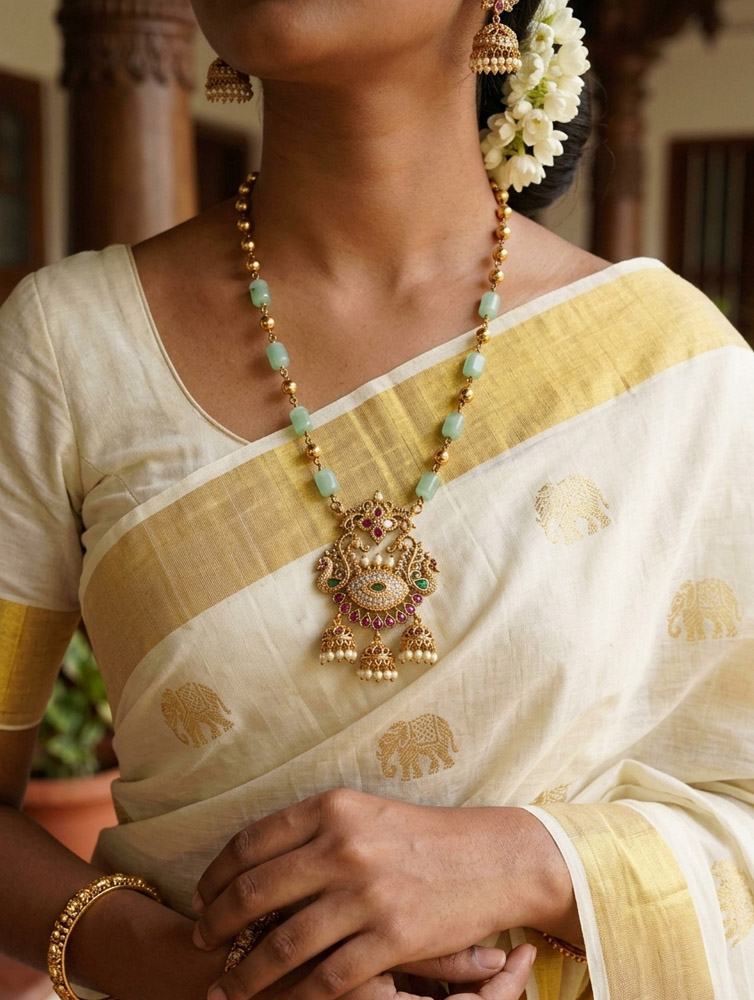 A graceful temple-inspired long chain adorned with soothing green beads and an intricately detailed pendant with delicate pearl drops. Designed to elevate sarees and festive looks with timeless elegance.