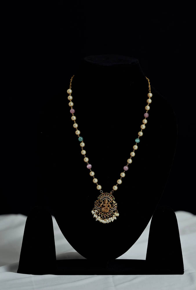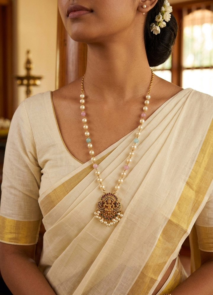 An elegant long chain crafted with luminous pearls and soft pastel beads, finished with a delicately detailed pendant and pearl drops. A timeless piece that adds grace and charm to traditional saree looks.