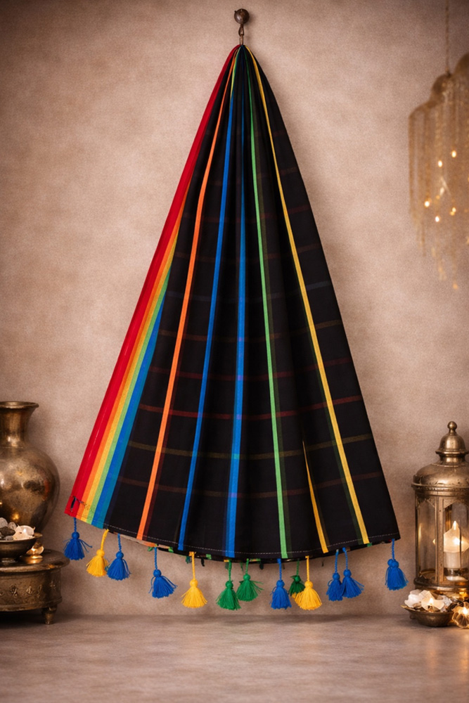 Vibrant and elegant, this mul cotton saree features striking rainbow stripes set against a rich dark base. Soft, breathable, and lightweight, it drapes beautifully, adding colour and charm to everyday styling.