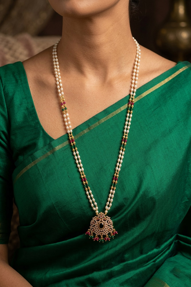 An elegant double-layered pearl chain accented with subtle ruby and emerald-toned beads, finished with a delicately crafted pendant. A timeless piece that beautifully complements traditional sarees and festive ensembles.