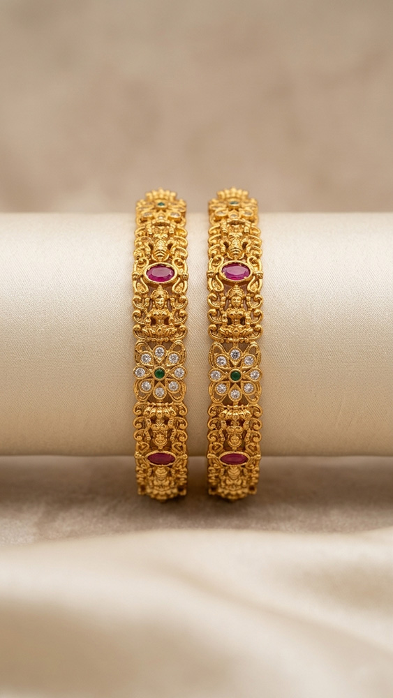 Elegant temple design bangles in an antique gold-tone finish, adorned with divine motifs, floral detailing, and ruby-green stone accents for a rich traditional look.
