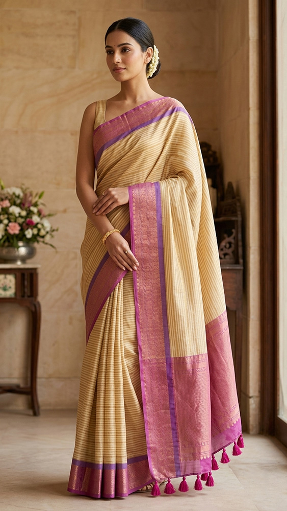 A graceful beige-toned mul mul saree adorned with fine woven stripes, a rich pink zari border, and elegant tassel detailing. Soft, airy, and effortlessly elegant, it is perfect for office wear, casual gatherings, day functions, and simple festive occasions.