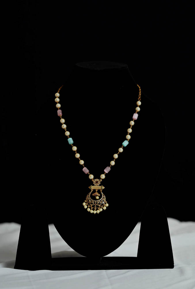 An elegant long chain crafted with luminous pearls and soft pastel beads, finished with a delicately detailed pendant and pearl drops. A timeless piece that adds grace and charm to traditional saree looks.