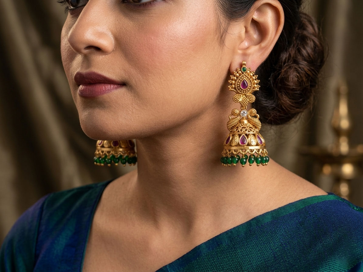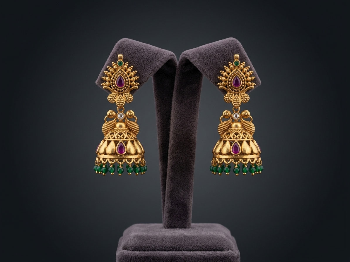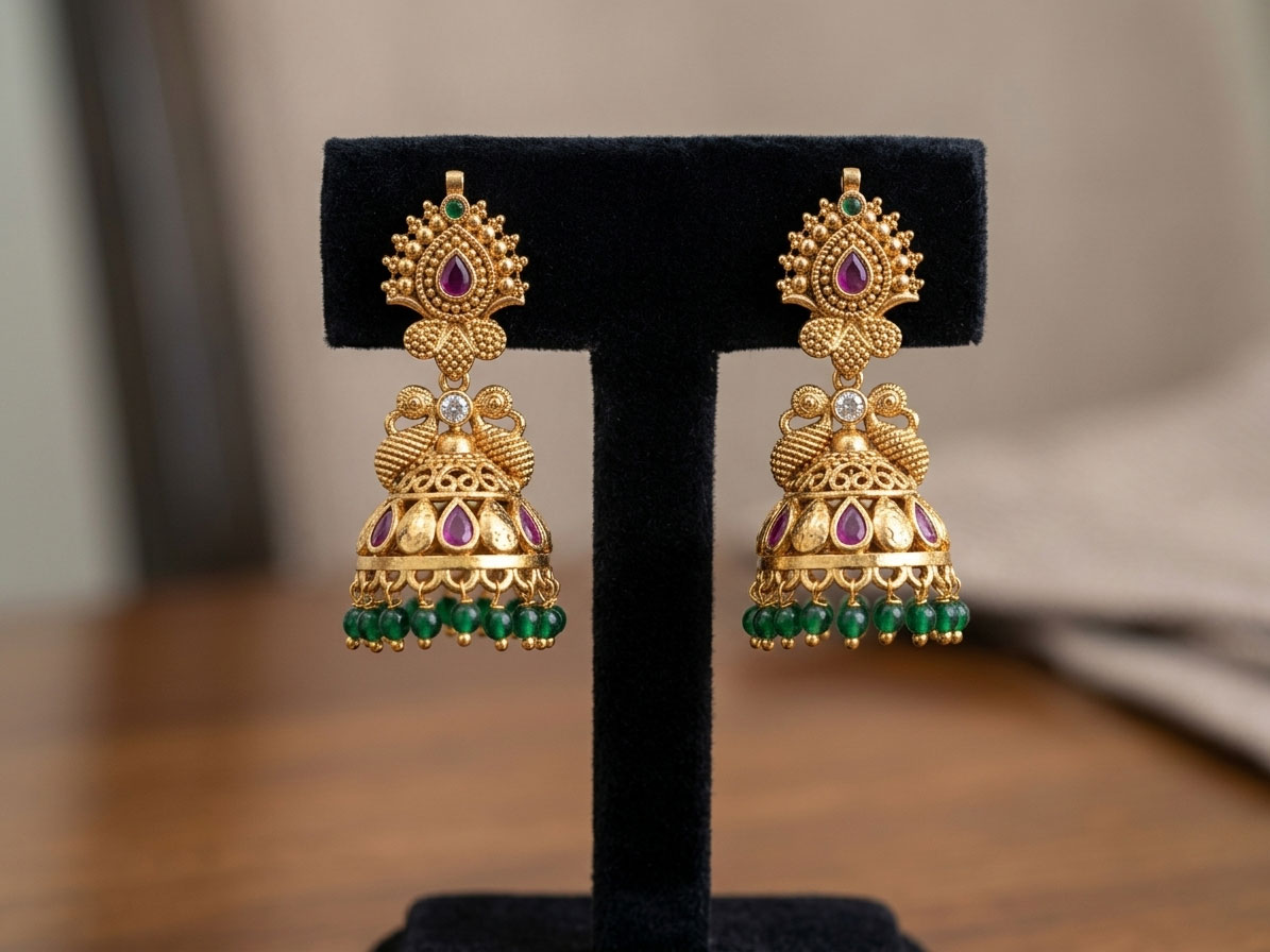 Traditional gold-tone jhumka earrings adorned with ruby-tone stone highlights, subtle green accents, and delicate green bead drops. Intricately crafted with a classic festive appeal, they are perfect for adding elegance to ethnic and special-occasion wear.