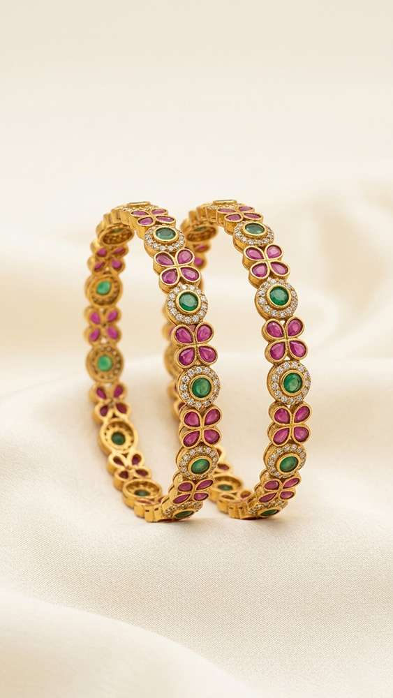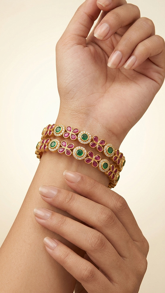 Elegant kundan bangle set featuring ruby-pink floral motifs, emerald-green stone accents, and sparkling embellishments in a rich gold-tone finish. Perfect for weddings and festive wear.