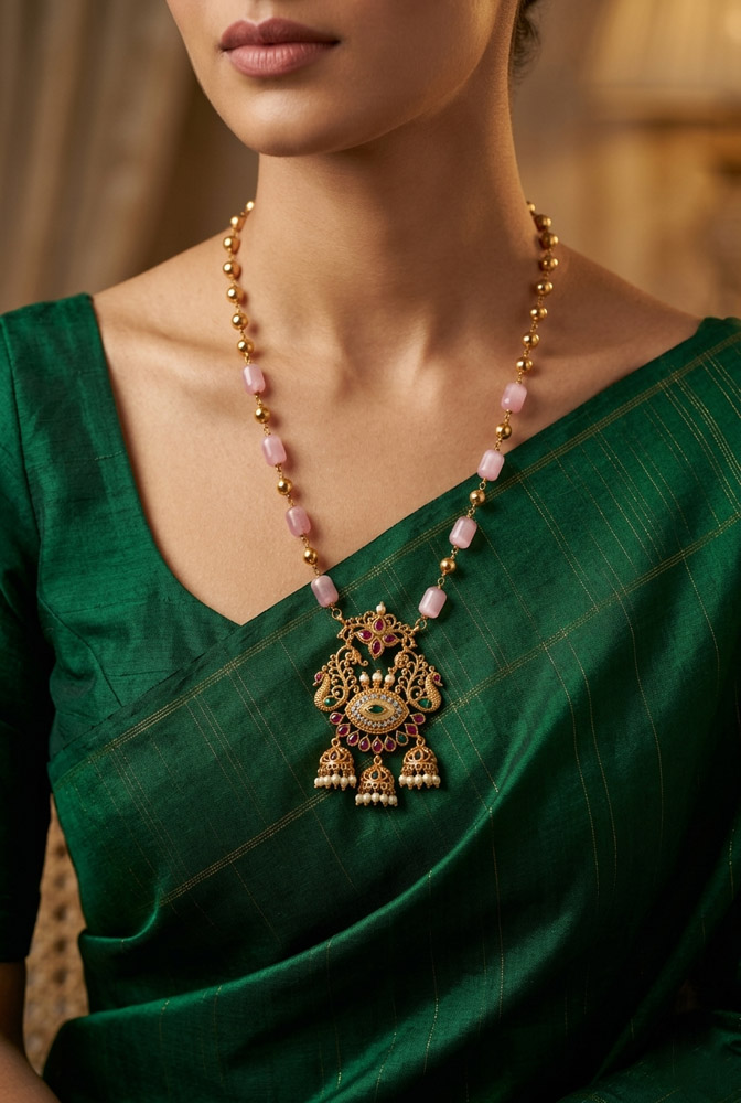 A graceful temple-inspired long chain adorned with soft rose-toned beads and an intricately crafted drishti pendant finished with delicate pearl drops. A beautiful piece that adds charm and traditional elegance to sarees and festive attire.