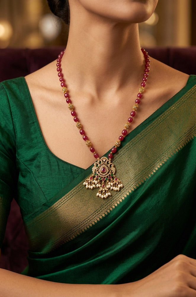 A stunning long chain adorned with rich ruby beads and an intricately crafted pendant embellished with ruby-toned stones and delicate pearl danglers. A regal piece that beautifully complements traditional sarees and festive attire.