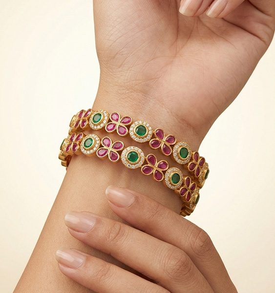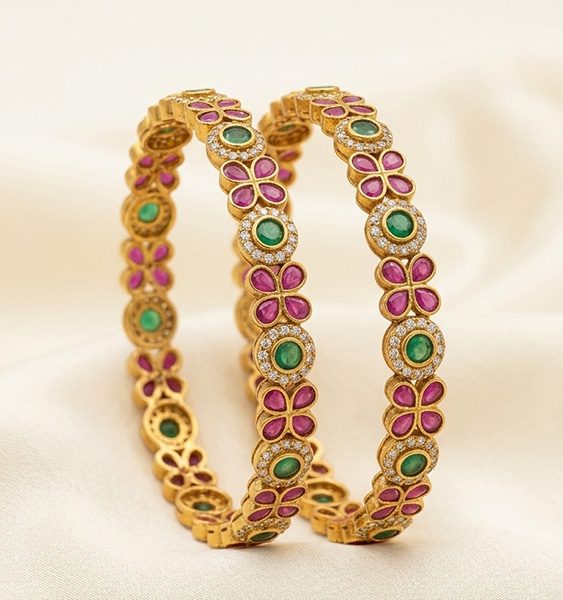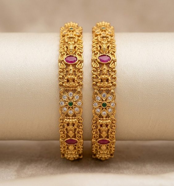 Traditional temple-style bangles in a rich gold-tone finish, adorned with ruby and emerald stone accents and fine white embellishments for a graceful festive look.